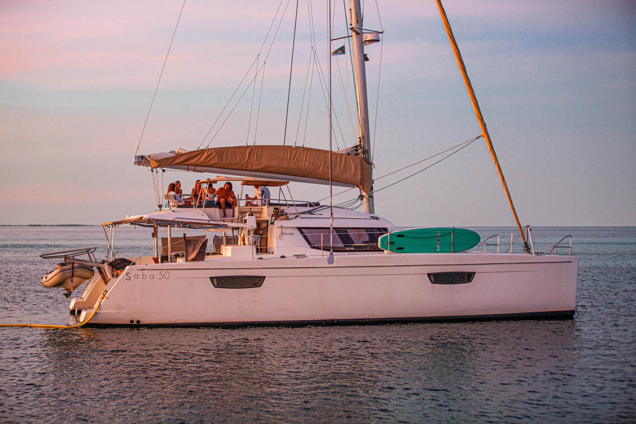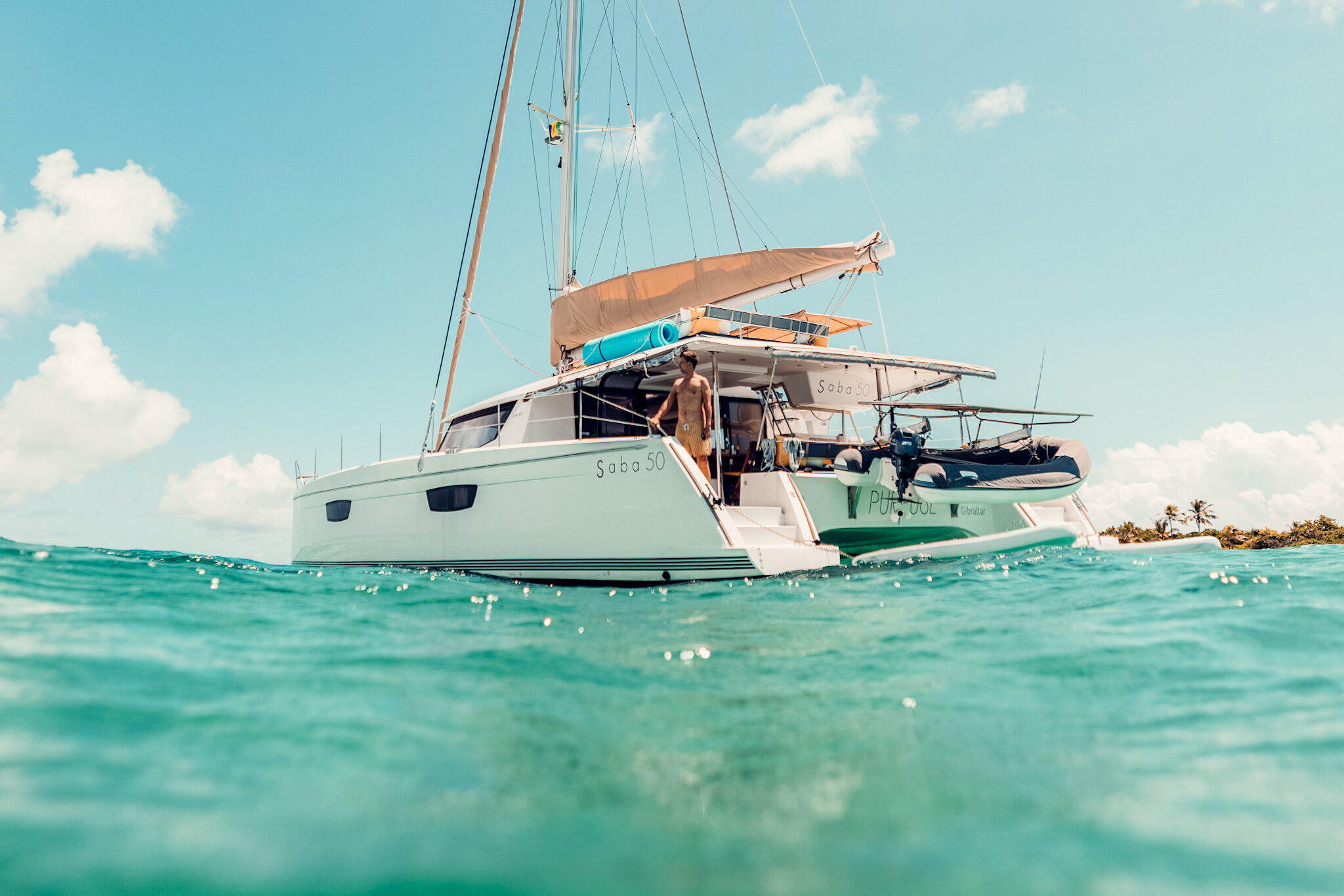 'Purpose' is a beautiful Fountaine Pajot Saba 50 catamaran and will be our home for the week. It's a luxury yacht with a huge amount of space, natural light and plenty of areas to relax together and privately.The open plan layout of the saloon and cockpit creates a sense of openness, and being a catamaran, everything is on the same level making it easy to move from the interior to the exterior. Most of our dining onboard will take place outside in the cockpit.One of the greatest advantages of sailing on a catamaran, compared to a monohull, is the added stability it offers. Say goodbye to worries about seasickness or discomfort in rolly anchorages. With the catamaran's balanced design, you can enjoy the journey with peace of mind. This makes it an ideal choice, particularly if you're newer to sailing.Purpose features 4 guest cabins, each with full-sized queen beds and ensuite bathrooms.